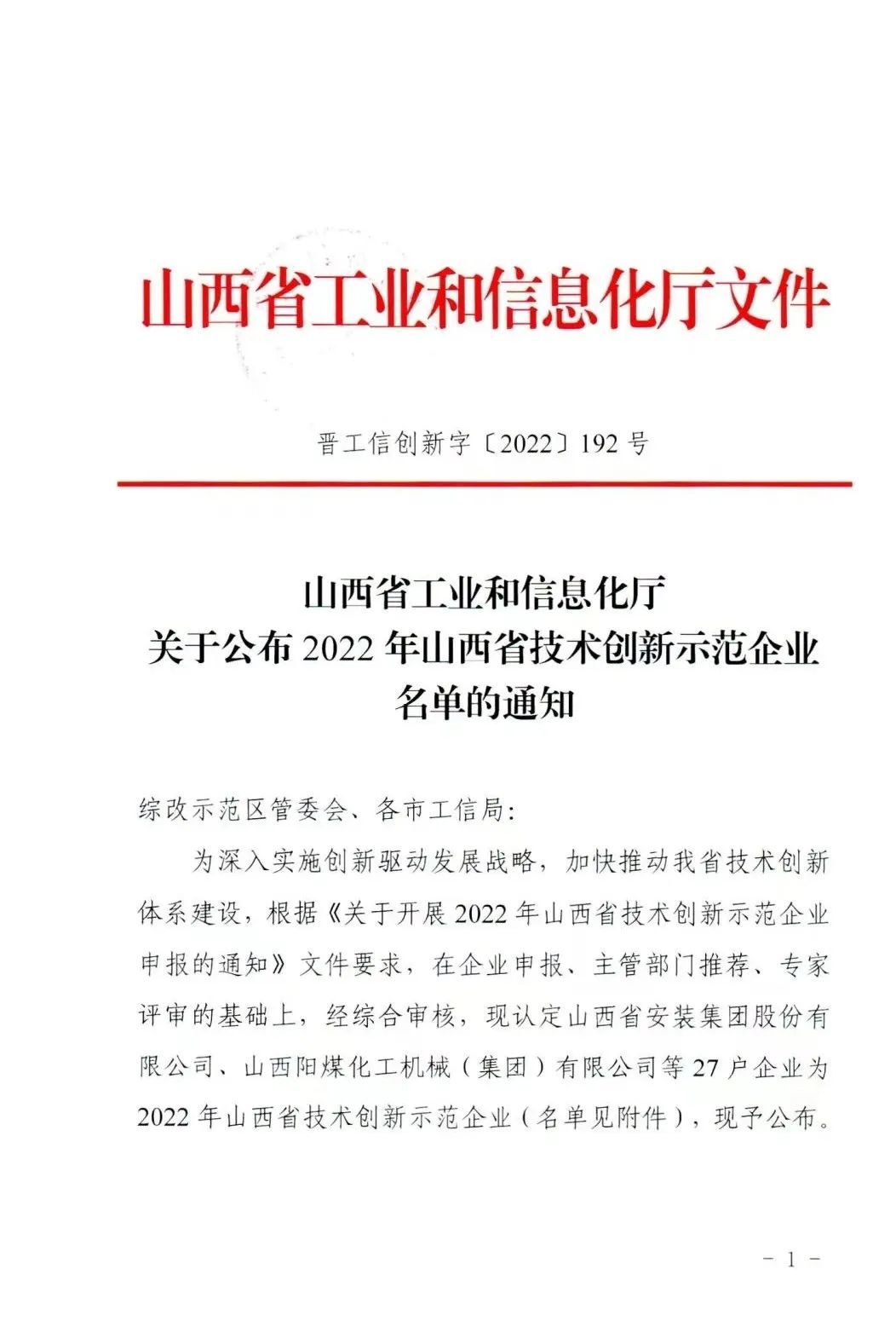 山西陽煤化工機械(集團)有限公司成功入選為2022年山西省技術創新示范企業02-20