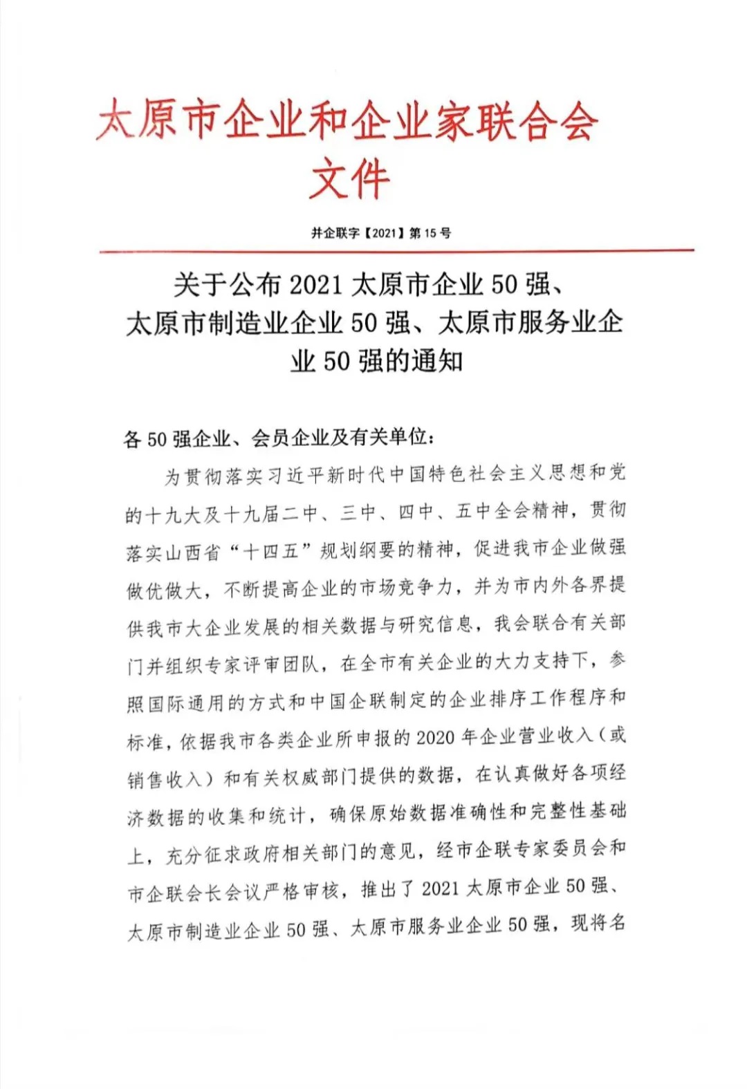 化機集團榮獲“2021年度太原市制造業企業50強”12-25